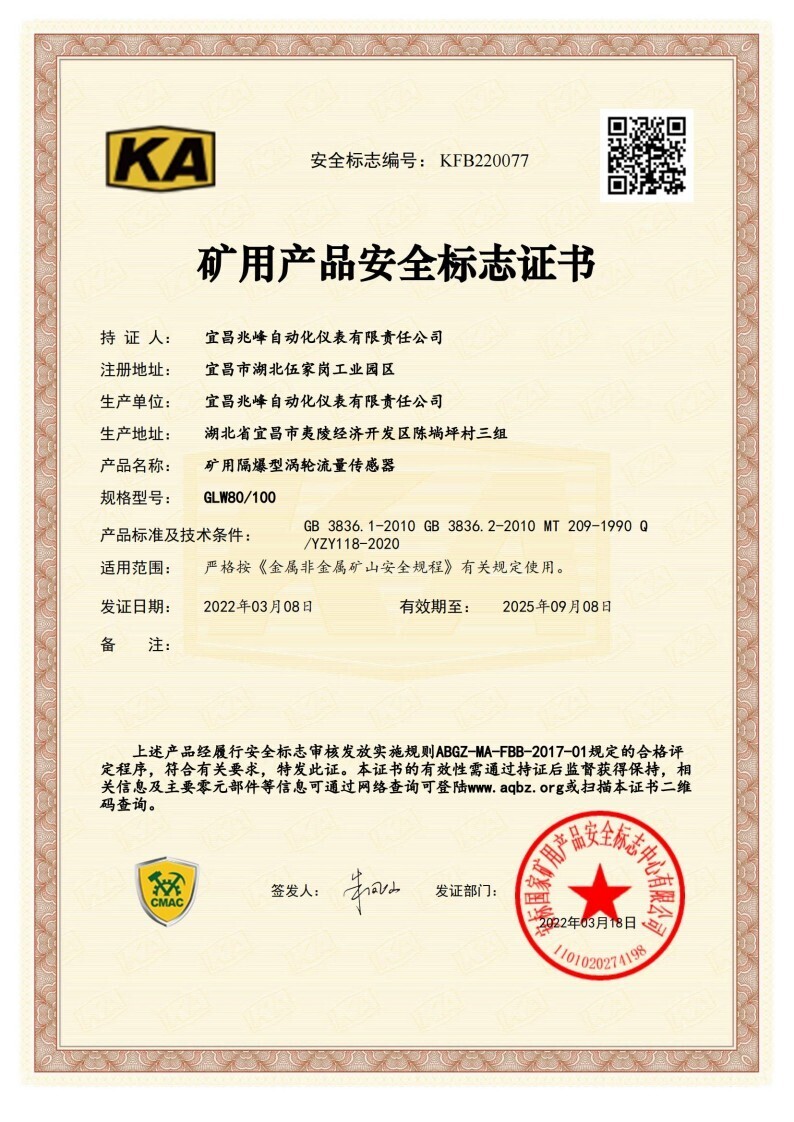 GLW Mining Датчик потока взрывозащищенной турбины_Сертификат безопасности шахты (Сертификат KA)